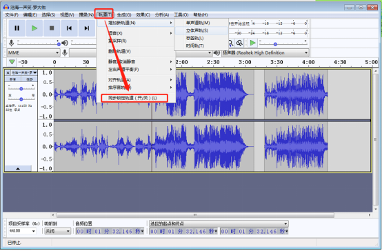 8、我们打开同步锁定轨道会发生什么情况呢?点击上方菜单栏中的【轨道】-【同步锁定轨道(开/关)】,就会打开/关闭同步锁定轨道。