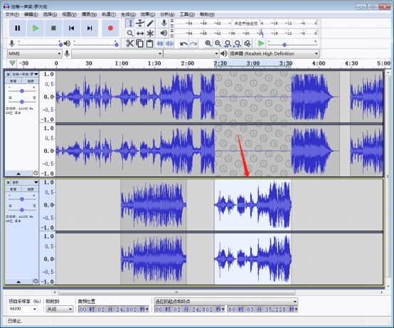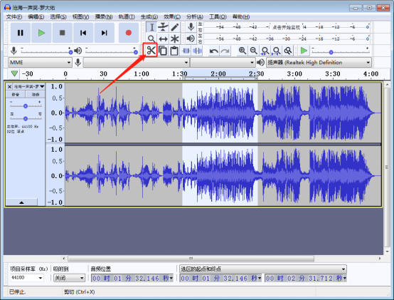 注意:利用音轨上方的时间轴来确定剪切的具体位置。