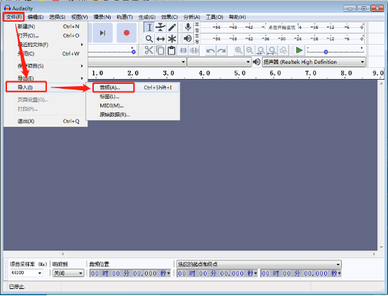 1、打开软件,点击左上方【文件】,在其下拉菜单中依次点击【导入】—【音频】。