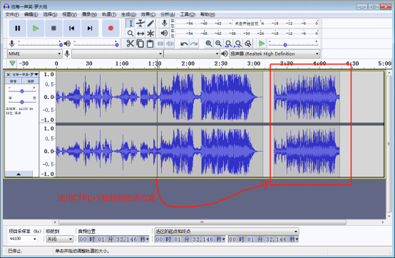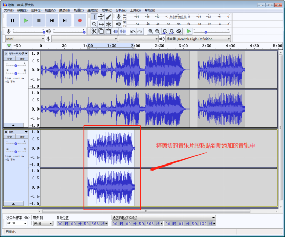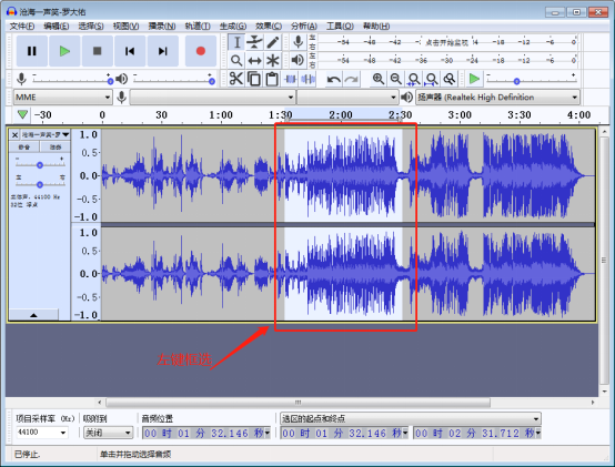 3、需要编辑的音乐就被导入到音轨中,使用左键框选需要剪切的部分。
