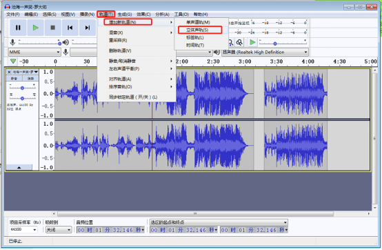 6、如果感觉音轨不够用,可以点击上方菜单栏中的【轨道】,在其下拉菜单中依次点击【增加新轨道】—【立体声轨道】。
