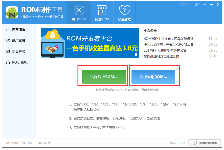 从本站下载安装ROM制作工具,打开软件,进入界面,如图,点击【选择线上ROM】或者【选择本地ROM】,选好之后,开始自动解包,