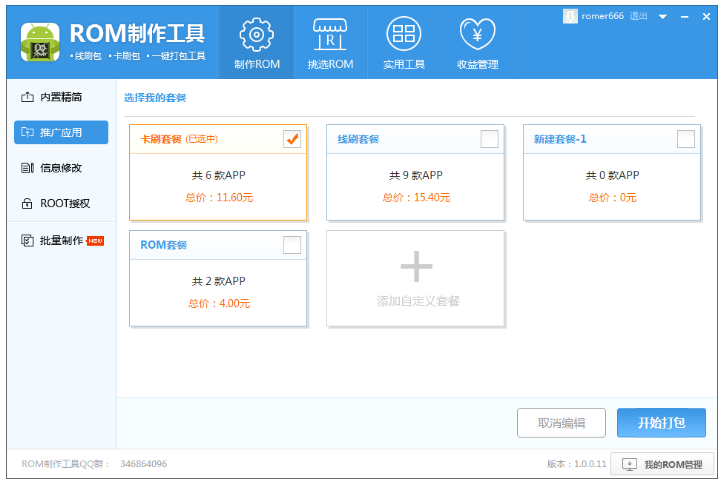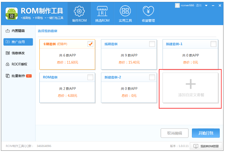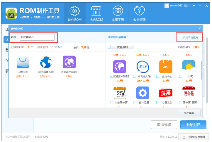 如图,点击【添加自定义套餐】,弹出窗口,设置套餐名称,选择你想内置的软件,选择【添加本地应用】 ,可以将本地软件集成在ROM包,设置完成,进行保存,