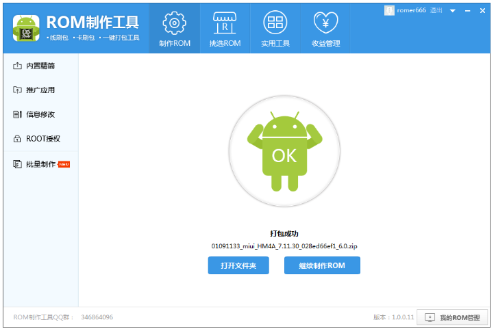 完成上述步骤,点击【开始打包】,ROM完成后会自动命名并弹出所在文件夹。
