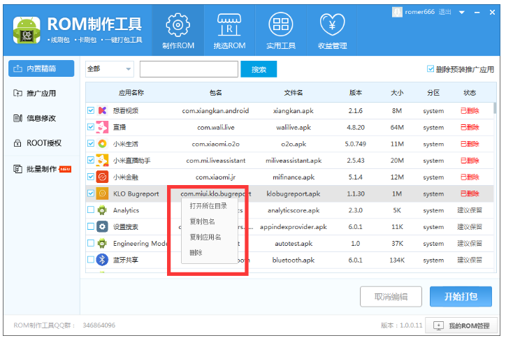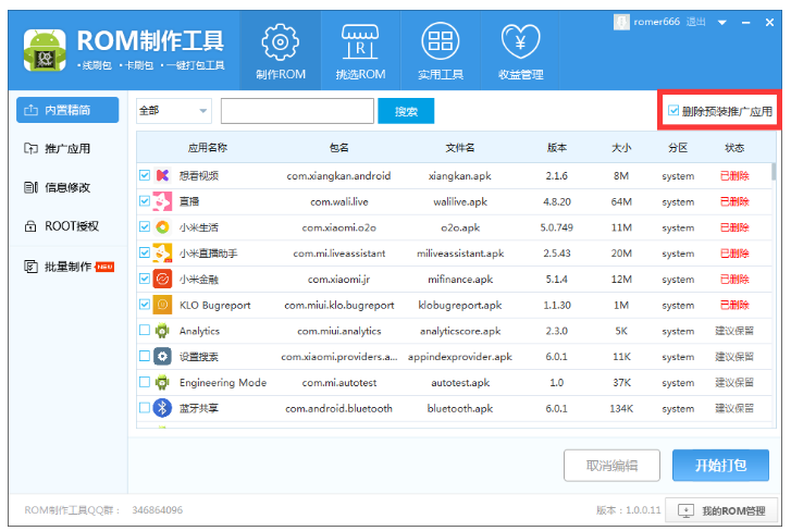 点击左侧栏的【内置精简】,工具会对ROM自动进行解包和精简,选择【删除预装推广应用】,进行选择性删除,