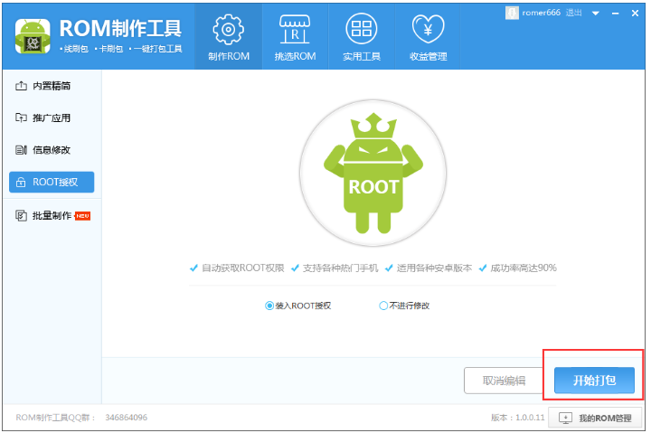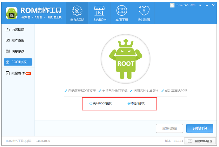 点击【ROOT授权】,默认不会对ROM进行添加ROOT,选择【装入ROOT授权】,自动为ROM包添加ROOT,此功能可以ROOT市面上绝大多数的ROM,