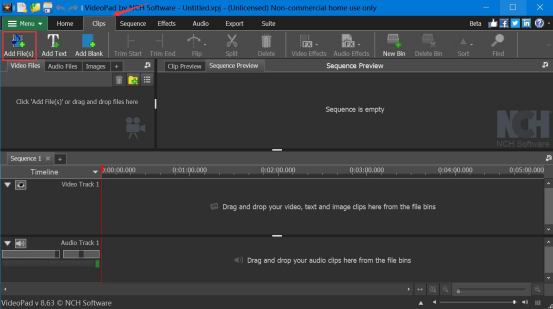 1.首先,用户打开VideoPad Video Editor。切换至“Clips”的菜单操作页面,点击“Add File(s)”。