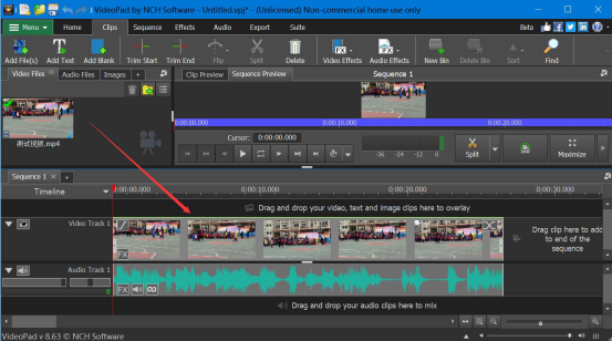 3.然后,在VideoPad Video Editor中,按住鼠标左键单击这个视频,将它拖拽到视频编辑区域。