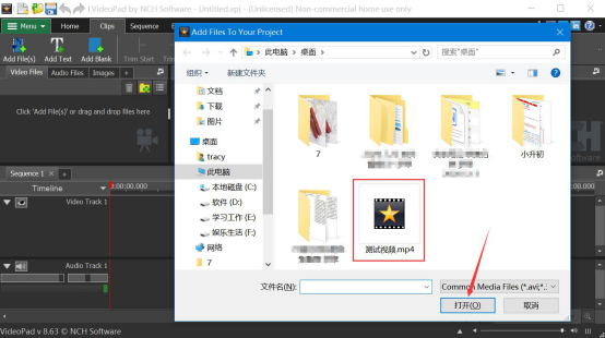 2.在弹出的窗口中,找到需要添加字幕的视频,点击“打开”按钮将该视频导入VideoPad Video Editor。