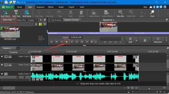 7.接着,我们在VideoPad Video Editor界面左侧点击切换至“Video Files”,并点击右侧视频预览窗口下方的“播放”按钮,预览添加了字幕的视频效果。