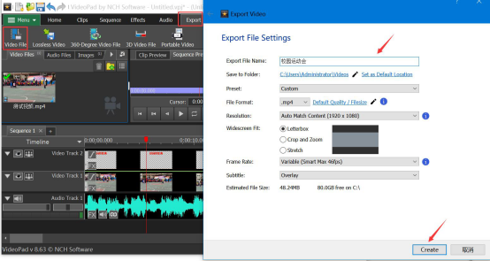 8.最后,切换至VideoPad Video Editor的“Export”菜单,点击“Video File”按钮。在它的弹窗中,输入添加了字幕的视频的名称,设置视频保存的格式、路径后,点击“Create”按钮即可完成视频的处理。