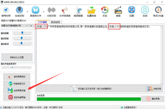 6.如果用户是选择由多个播报人将不同的文字段落转成语音的话,最后,要将多个角色合成,就可以在文字段落的逗号前,指定该句文字由特定的某位发音人播报。设置完成后,再点击“合成声音存储”按钮即可将该语音文件进行保存。