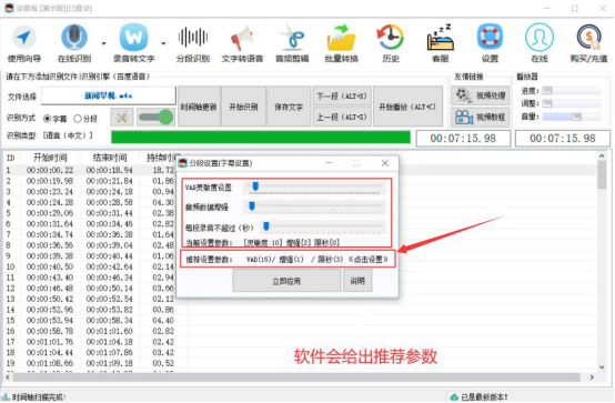 5.此时,录音啦便会弹出如下图的分段设置(字幕设置)窗口,用户可以根据它推荐的参数来设置语气停顿识别,设置完成后,点击“立即应用”按钮。