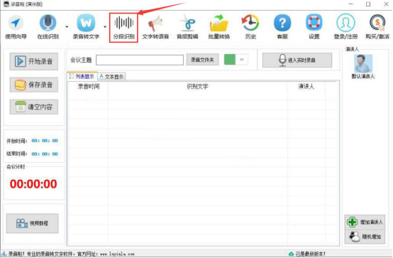 1.首先,进入到录音啦的操作界面,在菜单栏中点击“分段识别”功能。