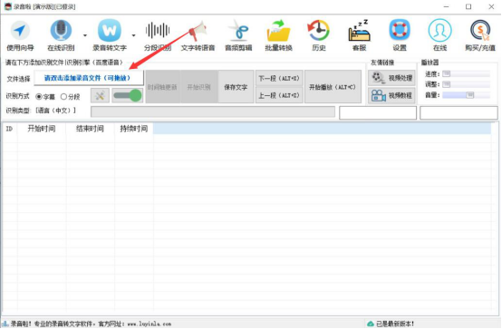 2.然后,在录音啦的分段识别操作界面中,点击“请双击添加录音文件(可拖放)”的按钮将需要设置语气停顿识别的录音文件导入。