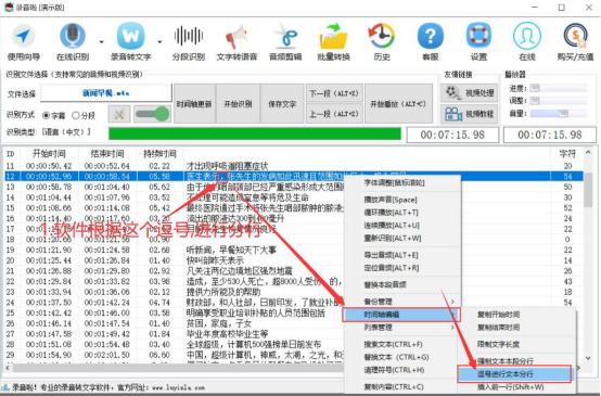 8.如果用户觉得它识别出来的文字段落太长,还可以右键单击自己觉得太长的文字段落,在其右键菜单中点击“时间轴编辑”中的“逗号进行文本分行”。