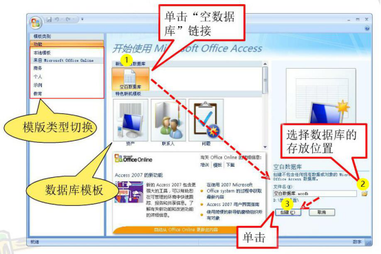 2.在使用access2007时,我们先选择“模板类别”中的模板,例如,可以选择“来自Microsoft Office Online”,在其右侧点击“空白数据库”,自定义数据库的名称,选择数据库的存放路径,再点击“创建”按钮。