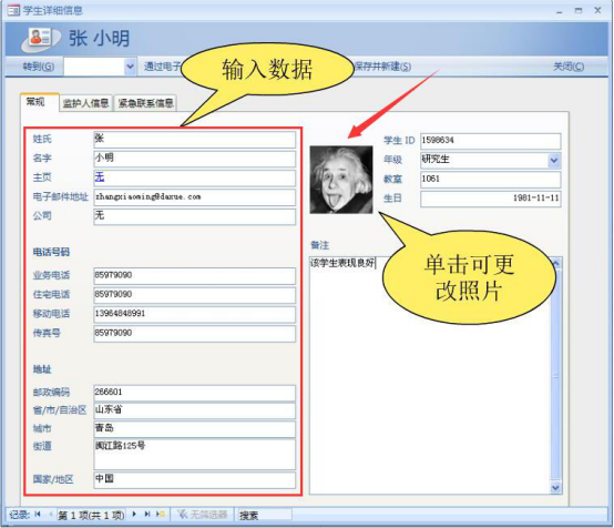 7.接下来,用access2007编辑学生详细的信息,如下图,不仅数据可以自定义,头像也也可以更换。