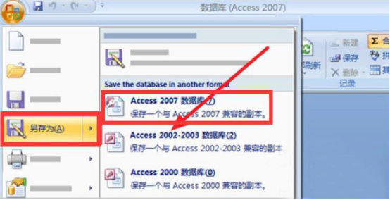 9.最后,access2007数据库编辑完成后,点击界面左上方的文件菜单的“另存为”,从中点选“Access 2007(数据库)”,便可以将自己的access2007数据库文件保存到自己设置的路径了。