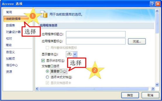 4.access2007数据内容创建完成后,打开它的选项对话框。点击“当前数据库”,就可以在右侧选择文档窗口的显示方式。