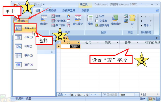 8.我们除了可以用access2007的模板创建数据库以外,还可以通过它的“表模板”来创建表数据。如下图,在“表模板”中点击“联系人”,便可以在编辑区域设置“表”字段了。