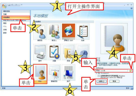 5.在使用access2007时,也可以在模板类别中,点击“本地模板”,单击选择自己想要的具体模板,例如,这里选择“学生”模板。同样的,自定义文件名,设置文件保存路径后点击“创建”按钮。