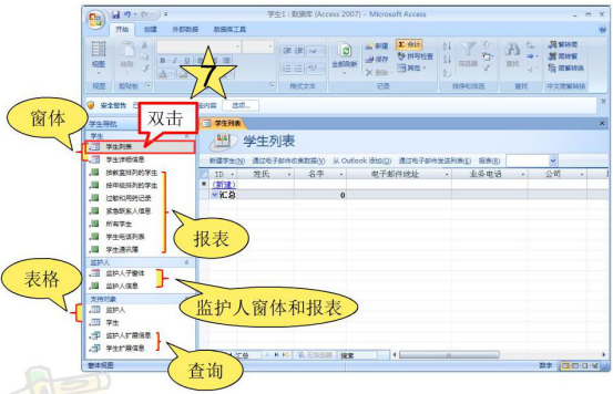 6.此时,access2007便会进入操作主界面。双击左侧的“学生列表”,其右侧便会展现出学生的数据库模板信息。