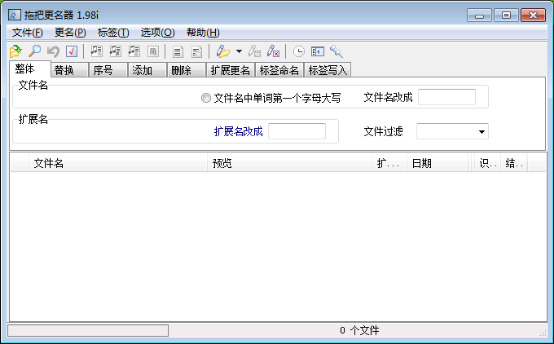 2、安装完成后打开拖把更名器,可以看到图中的【整体】、【替换】、【序号】、【添加】、【扩展更名】、【标签命名】、【标签写入】,这些是拖把更名器主要功能键。