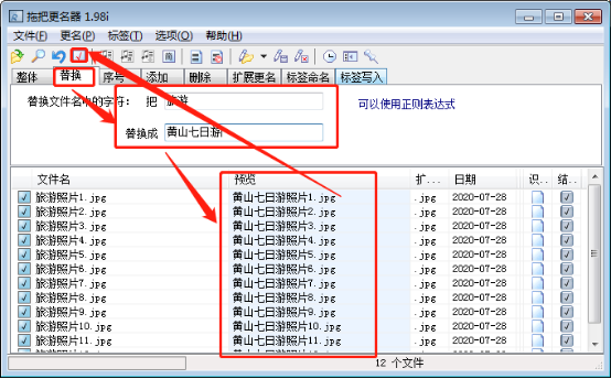 7、下面我们接着来说一下【替换】。点击【替换】功能键,将刚刚处理的图片中的“旅游”替换为“黄山七日游”,在预览中就会看到重命名后的照片名称,点击【√】应用即可。