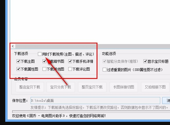 2.粘贴好链接,我们在下方找到“下载选项”这个模块,毕竟页面图片较多,可能会下载到一些无用图片,这里就可以设置了,另外还可以下载一些商品视频等,可以根据需要勾选