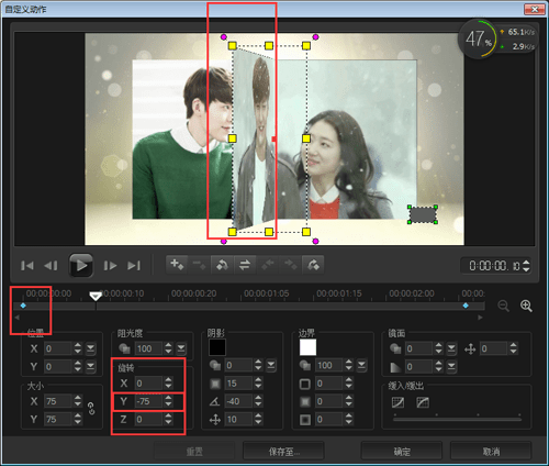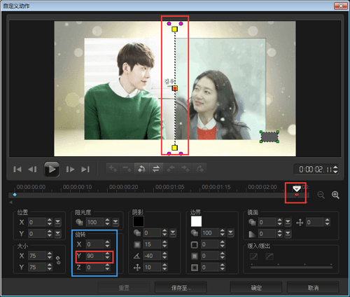 旋转的设置主要是对于覆叠轨3中的素材设置的,选中覆叠轨3中的素材2,右击鼠标选择自定义动作,将起始帧的旋转参数设置中Y的数值设置为-90,点击确定;使素材2左侧部分从中间往左侧旋转