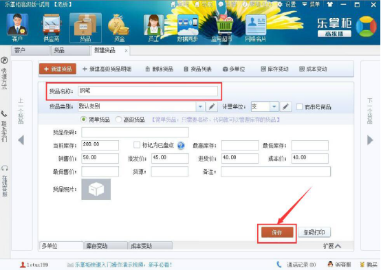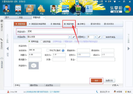 2.输入货品名称、库存、价格,点击“保存”按钮。