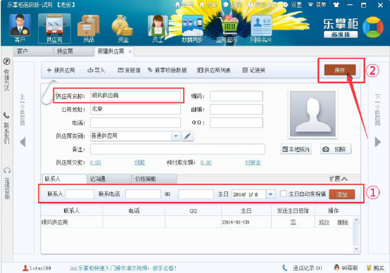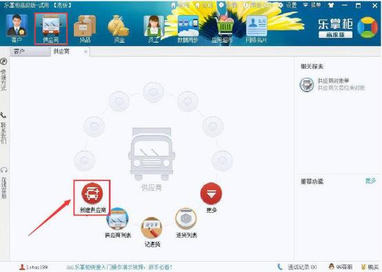 7.接下来,说说乐掌柜快速入门时怎么录入供应商资料。点击“供应商”菜单页中的“新建供应商”。