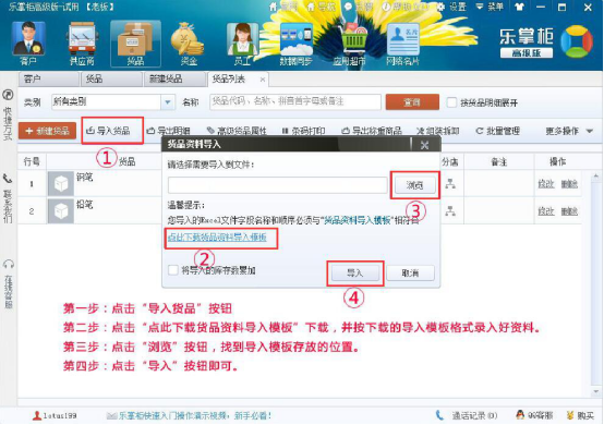 5.除此之外,也可以点击乐掌柜的“导入货品”按钮,弹窗中,点击货品资料的模板录入货品数据后,点击“浏览”选择文件,再点击“导入”按钮。