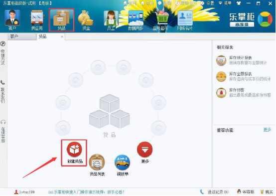1.想要快速入门乐掌柜,就得先了解怎么录入货品资料。点击“货品”菜单页面中的“新建货品”。