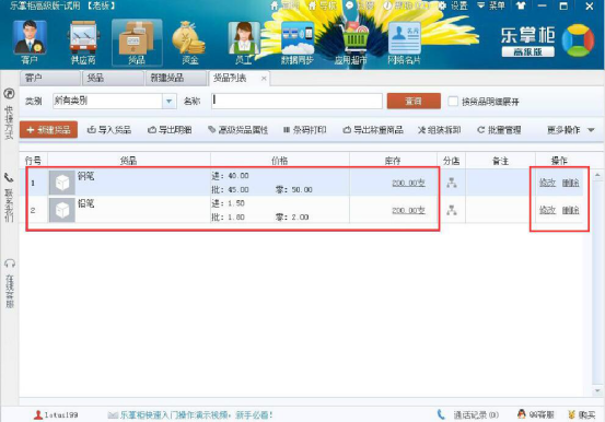4.此时,便可以看到自己录入的两项货品资料了,还可以进行修改或者删除操作。