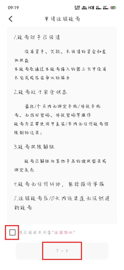 3.然后我们需要仔细阅读注销协议,勾选【我已阅读并同意……】,点击【下一步】(注意,账号注销后10天内该渠道无法创建新账号);