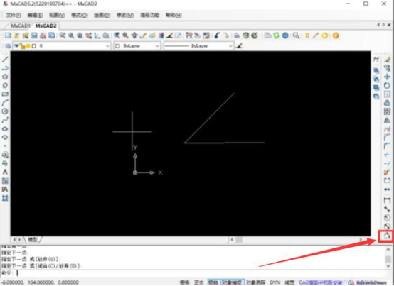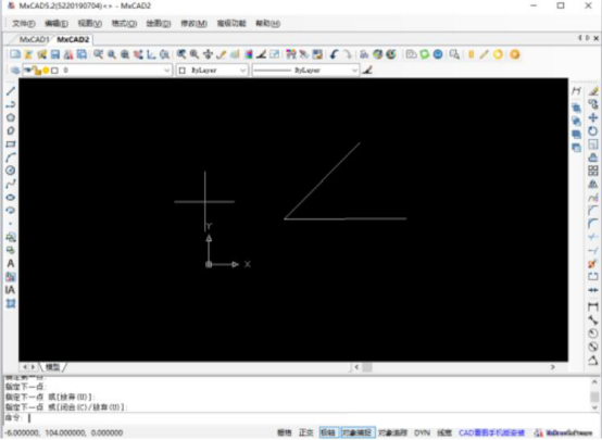 1.首先,用户打开梦想CAD软件。在左侧工具栏中调用直线工具,在绘图区域绘制两条同样起点的直线形成一个角度来作为参照物。