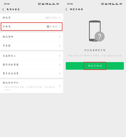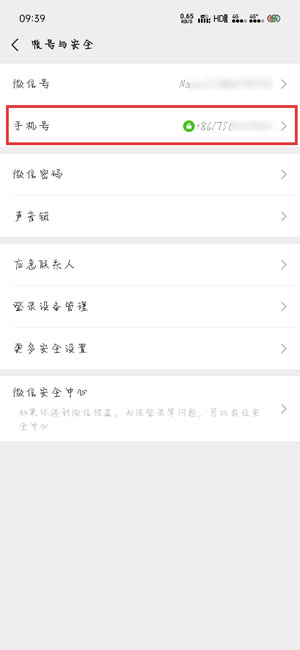 2.打开另一个微信号,同样进入【我 - 设置 - 账号与安全】页面,选择【手机号】进入选择【绑定手机号】;