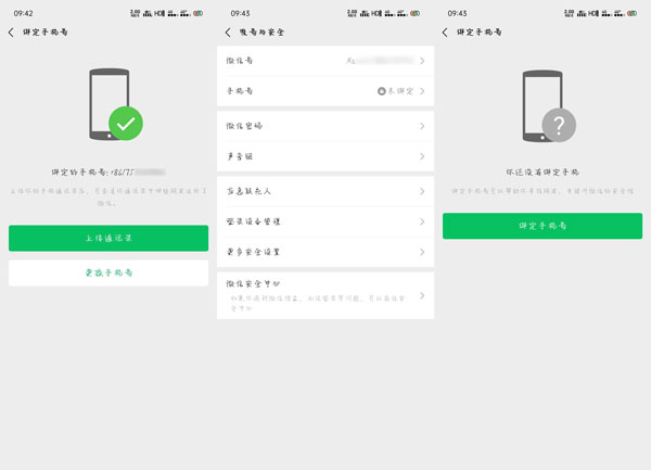 1.打开微信,进入【我 - 设置 - 账号与安全】页面查看当前绑定的手机号码,然后打开另一个微信号,该微信号无论绑定或者没有绑定手机号码都可以;