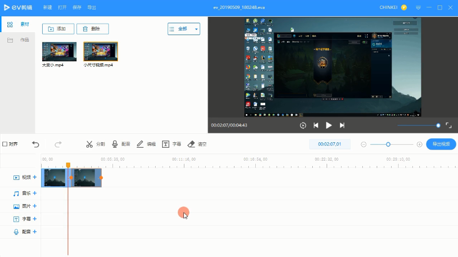 3.打开EV剪辑软件,将大尺寸的视频添加进来,记住是大尺寸的,不要选择错了