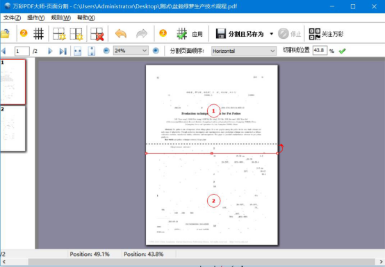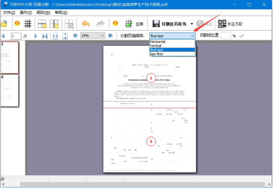万彩办公大师在分割PDF页面的过程中,要根据自己的需要选用相应的分割线类型,分割线添加并调整好位置后,选择分割的顺序,再选择相应的分割方向。一定要注意分割的方向是和分割线的类型相对应,这样分割出来的PDF页面才正确、美观。