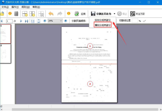 7.接着,我们点击PDF页面分割工具界面的“分割且另存为”功能。根据自己的需要选择纵向还是横向。例如,本文选择横向。