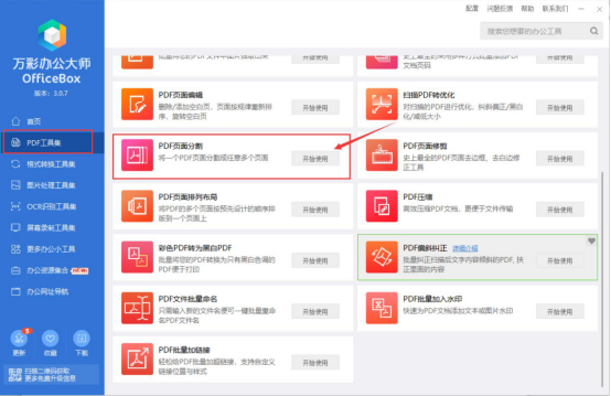 1.首先,我们打开万彩办公大师。在其左侧功能菜单中点击“PDF工具集”,并从右侧工具列表中点击PDF页面分割的“开始使用”按钮。
