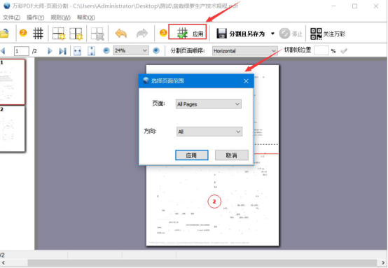 6.如果想将当前的设置同样应用到其他页面,就可以点击万彩办公大师的PDF页面分割工具界面中的“应用”功能按钮,并在其弹窗中选择页面范围,点击“应用”按钮。