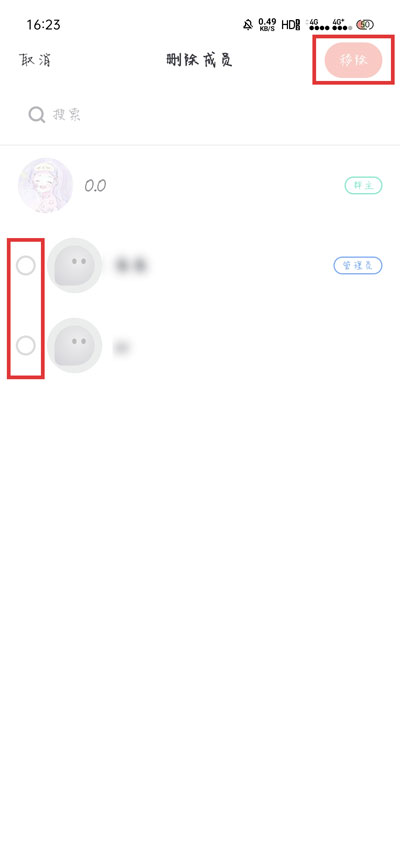 4.最后在删除成员页面,勾选或者搜索需要删除的成员,点击右上角的【移出】,即可将选择的成员从群内删除;