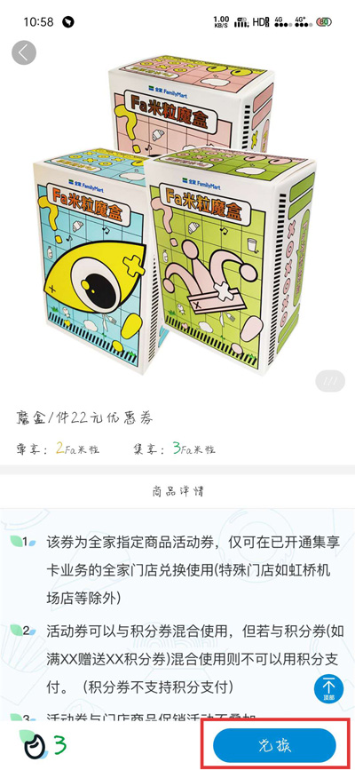 5.点击进入物品详情页面之后,可以看到尊享卡和集享卡所需要的fa米粒,点击【兑换】扣除相应的fa米粒即可兑换到物品;