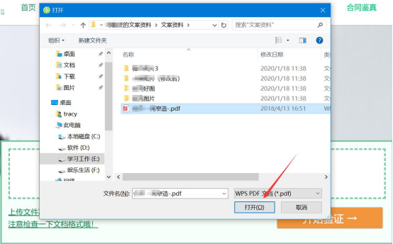 2.然后,在弹出的窗口中找到需要验证电子签名真伪的PDF文件,点击“打开”按钮。