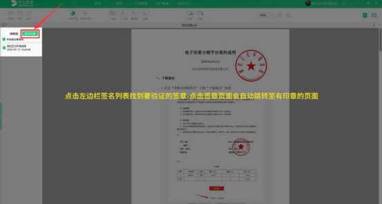 3.将需要验证的文件导入大众签章后,点击左侧栏的签名列表,从中找到要验证电子签名真伪的签章。并在右侧的签章页面点击一下,它便会自动跳转到有印章的部分,可以从中看到它的电子签名。如下图。