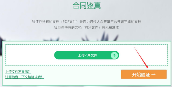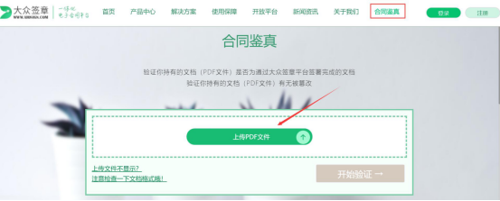 1.首先,打开大众签章的官方网页。点击“合同鉴真”,并从其页面中点击“上传PDF文件”按钮。